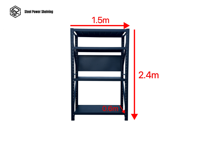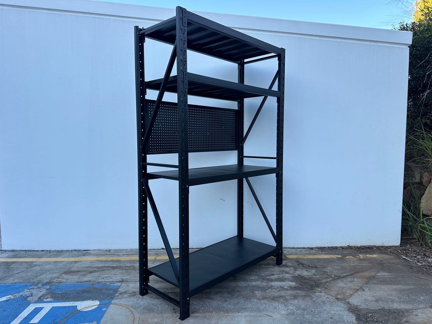 4 shelves per bay with 1 unit of pegboard